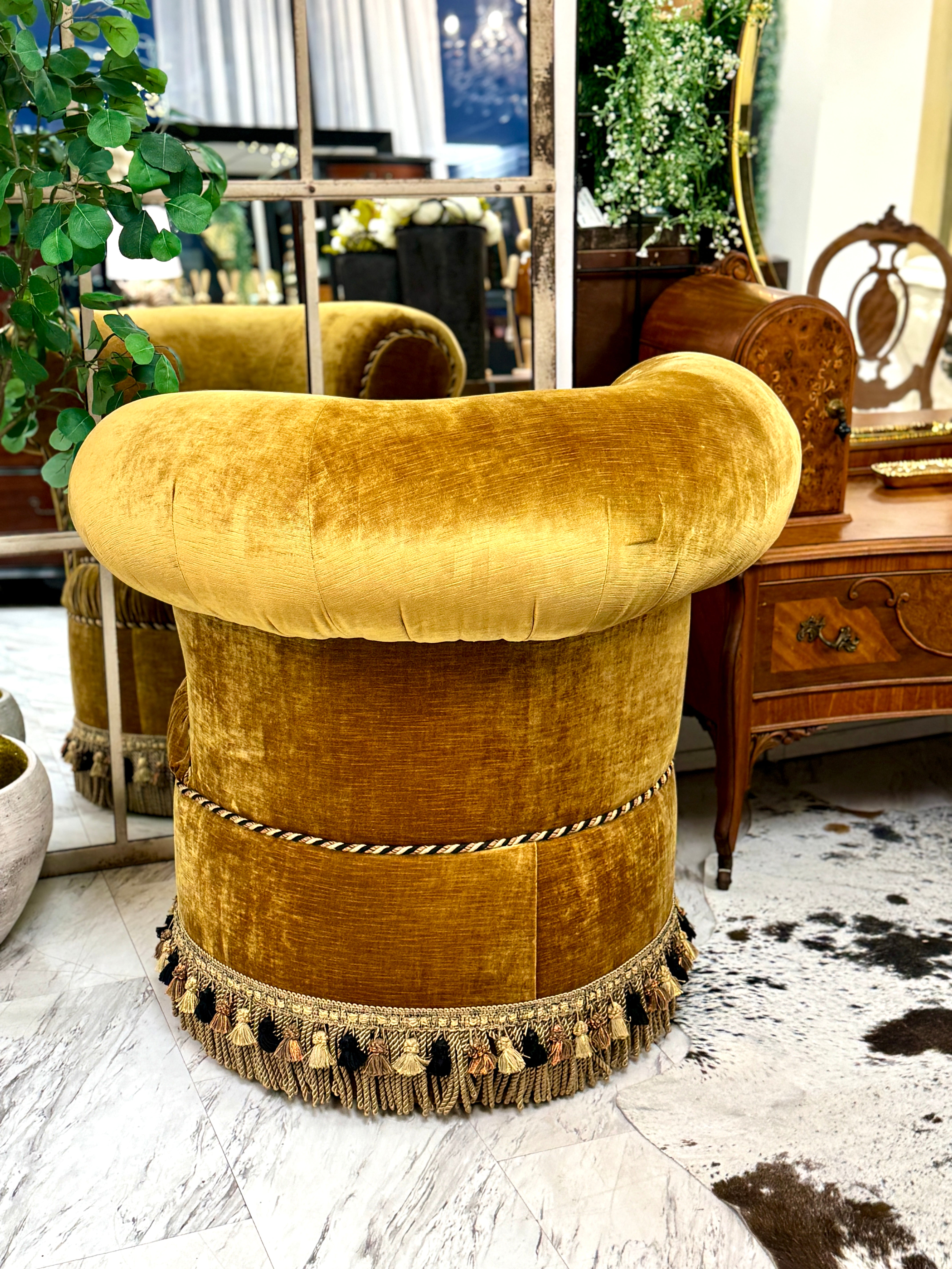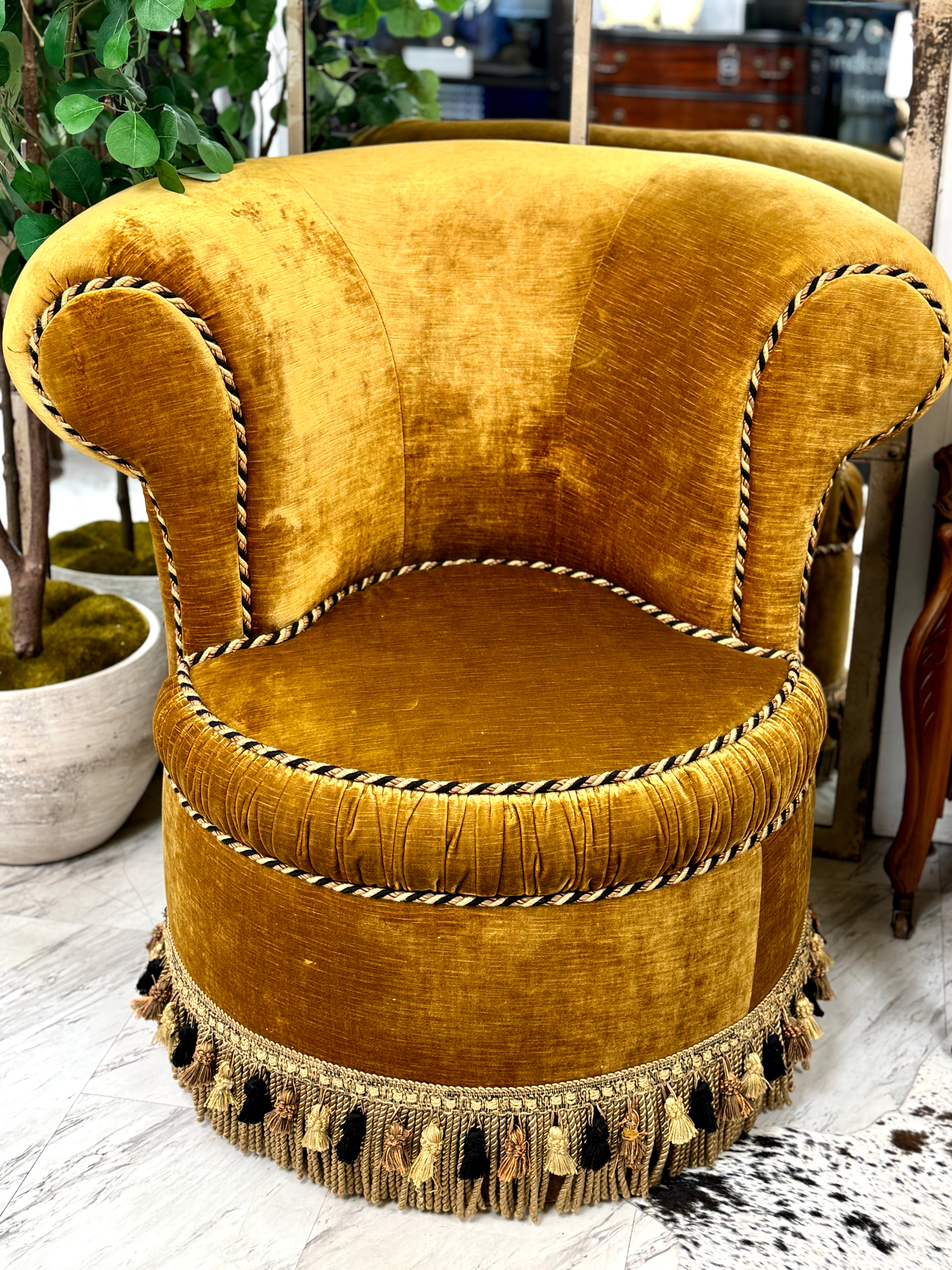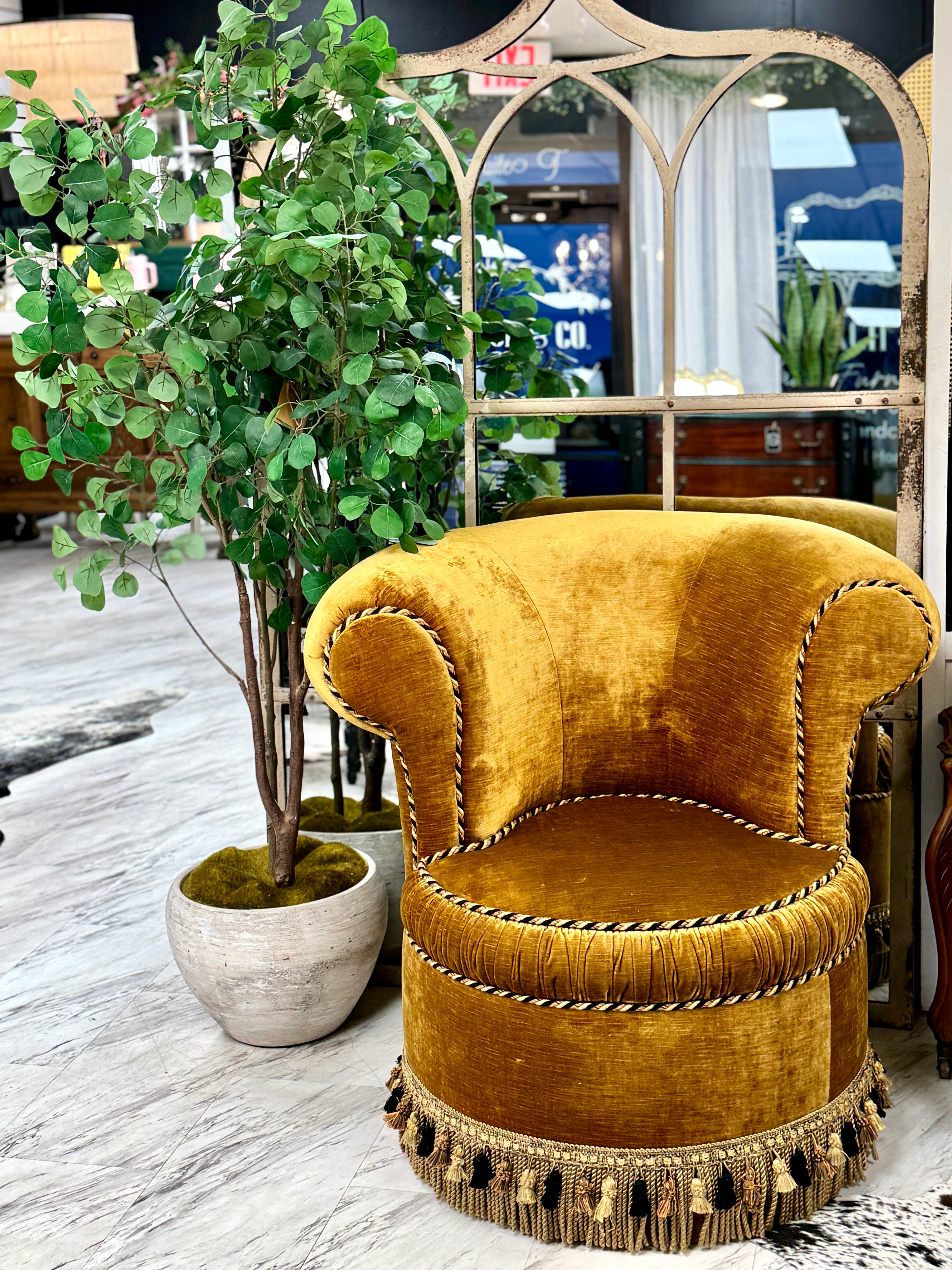29 w x 21 d x 19 h; back: 39 w x 16 d x 36 h. No rips, stains or tears. Chair is larger in person than it appears in photo. Delivery available. Golden color. Velvet.