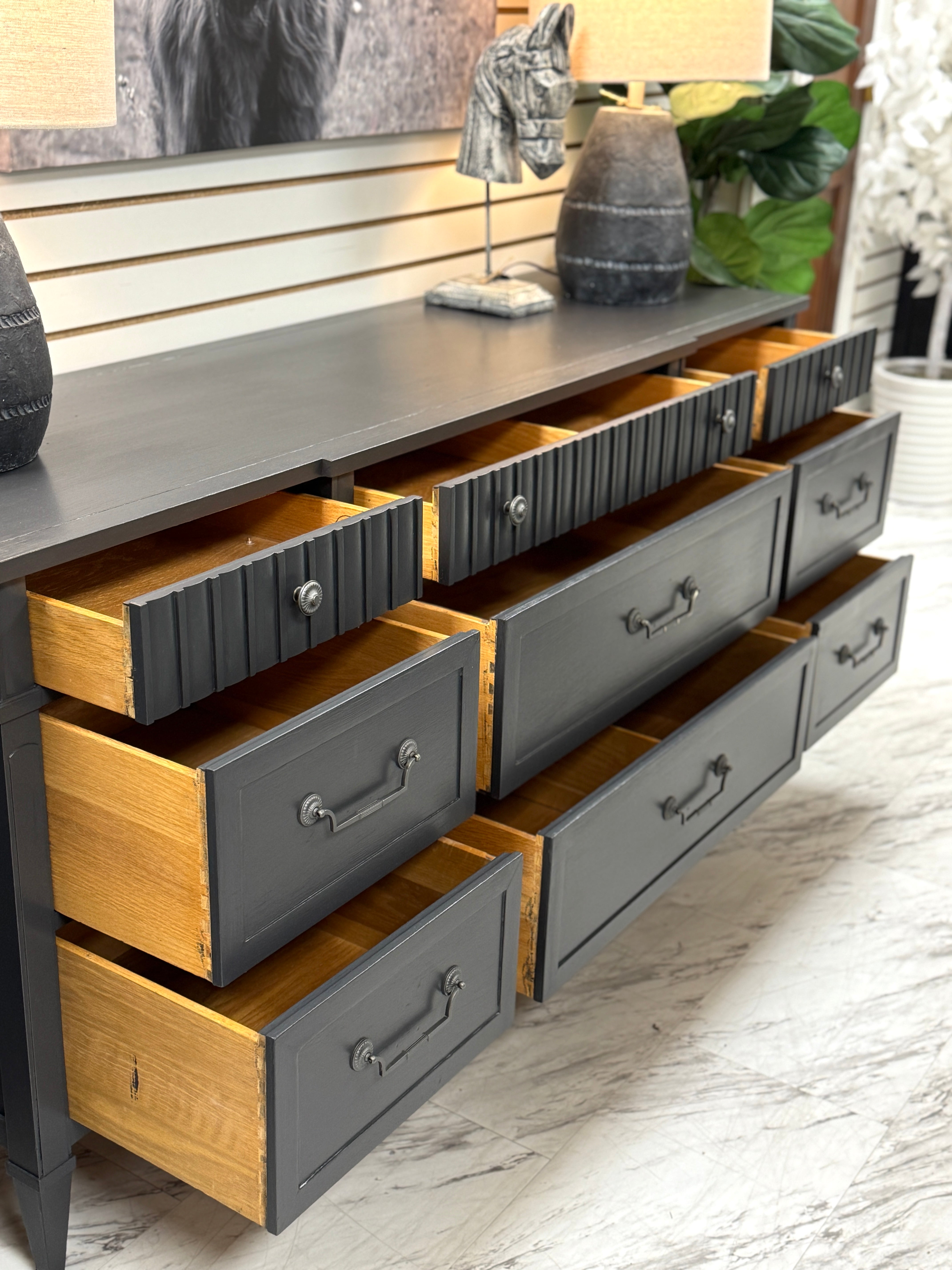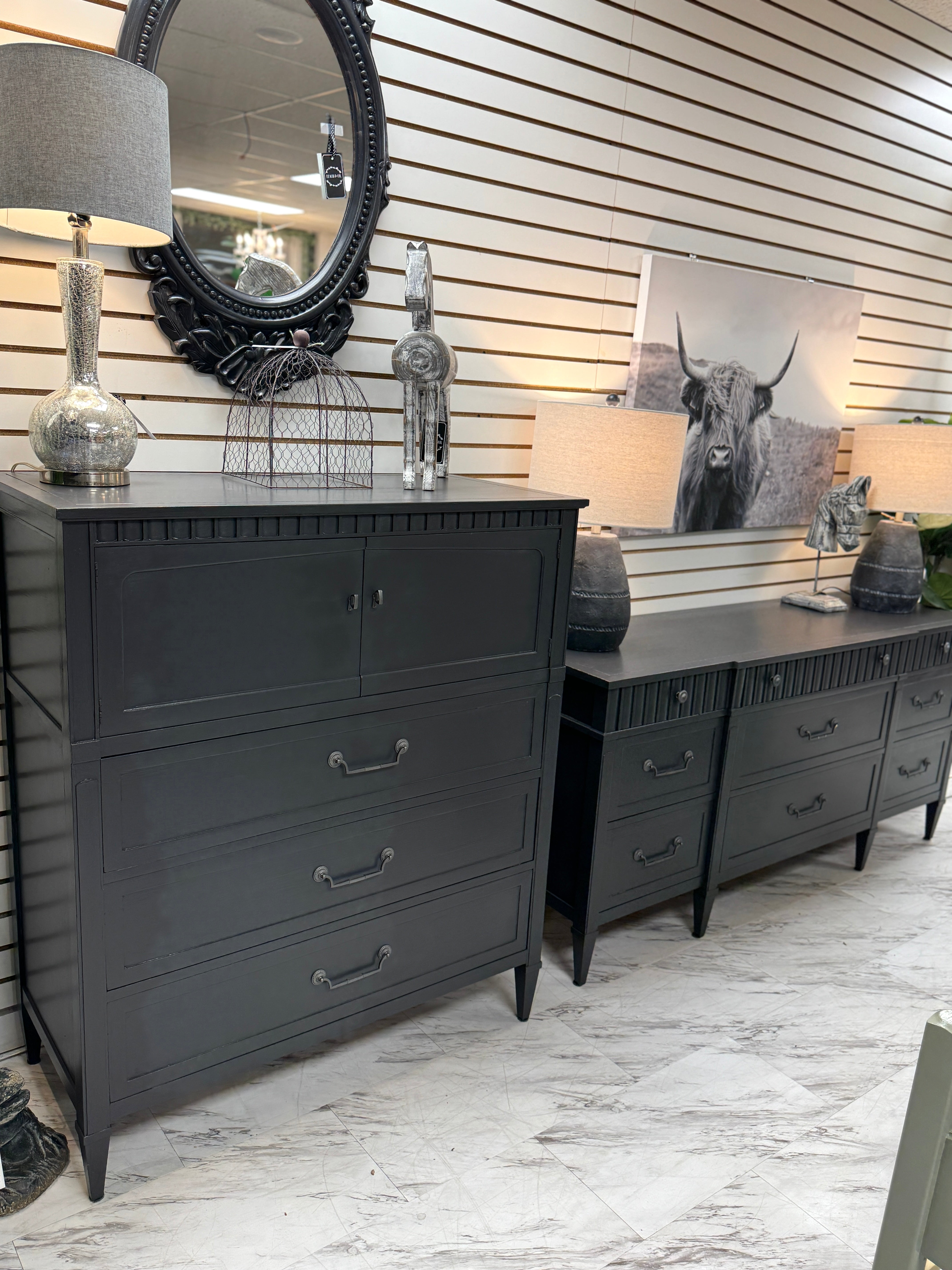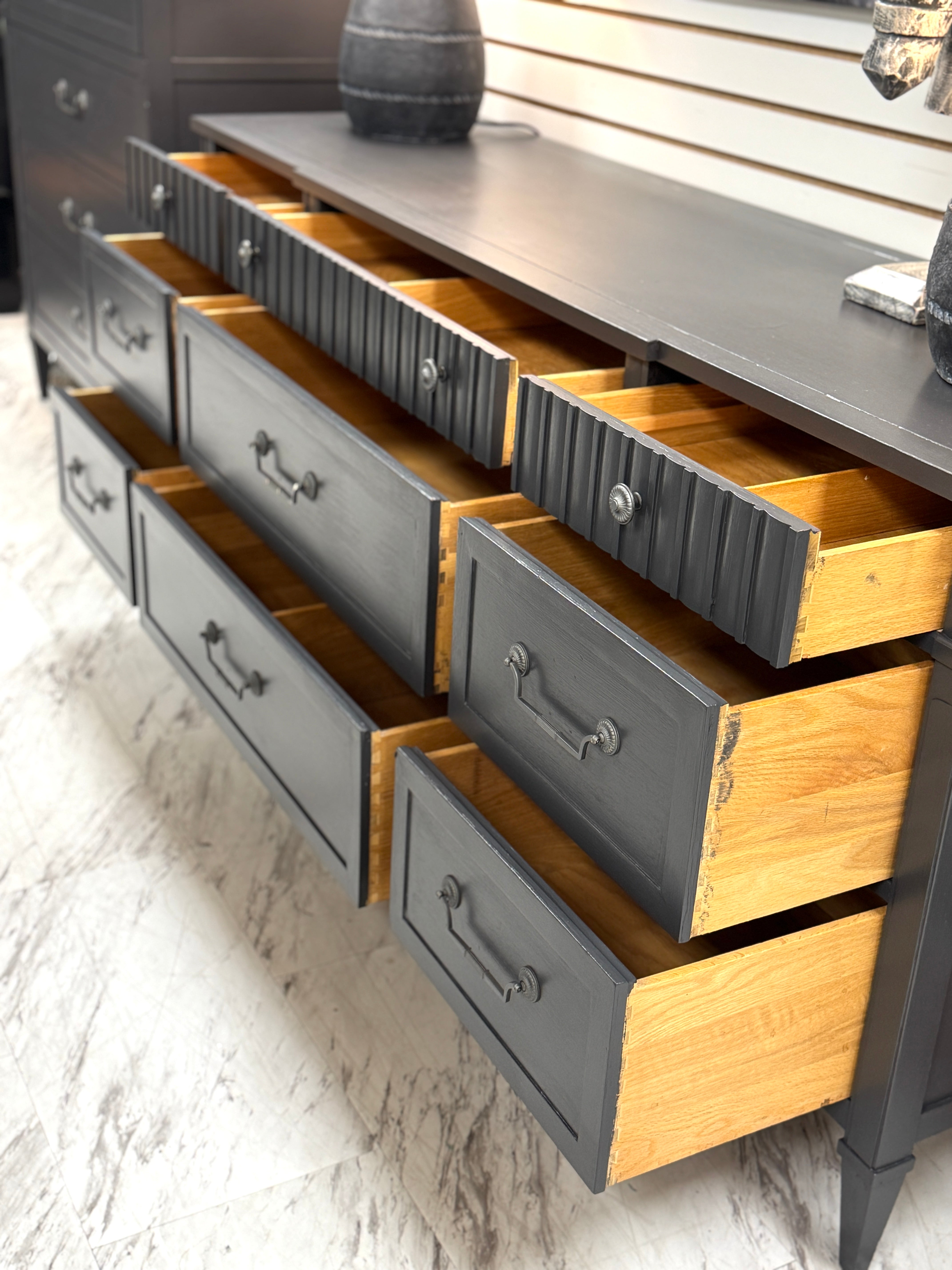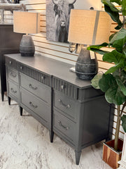 70 1/2 w x 20 d x 32 h. Gray. Matching chest available separately. Delivery available. Very heavy.