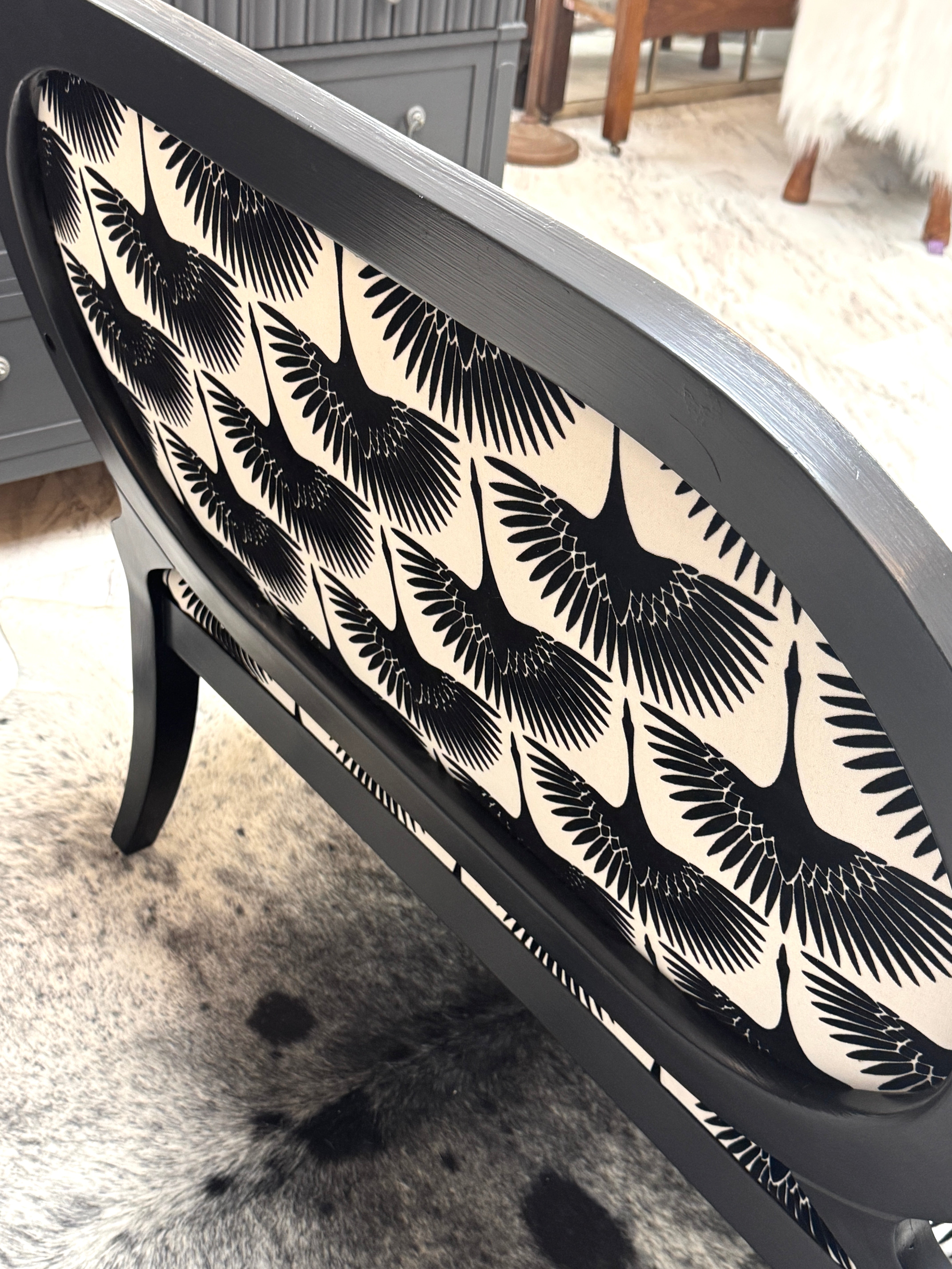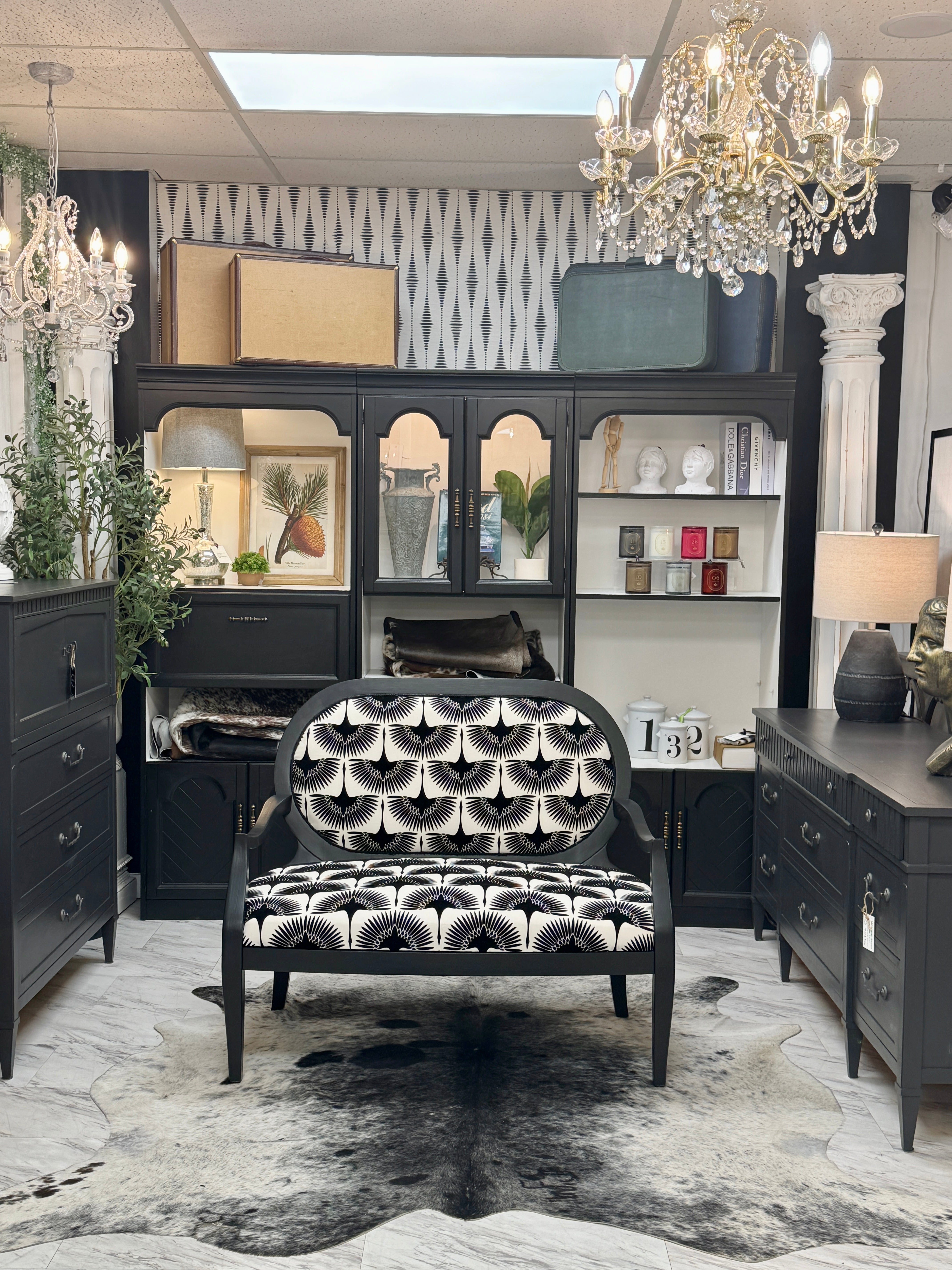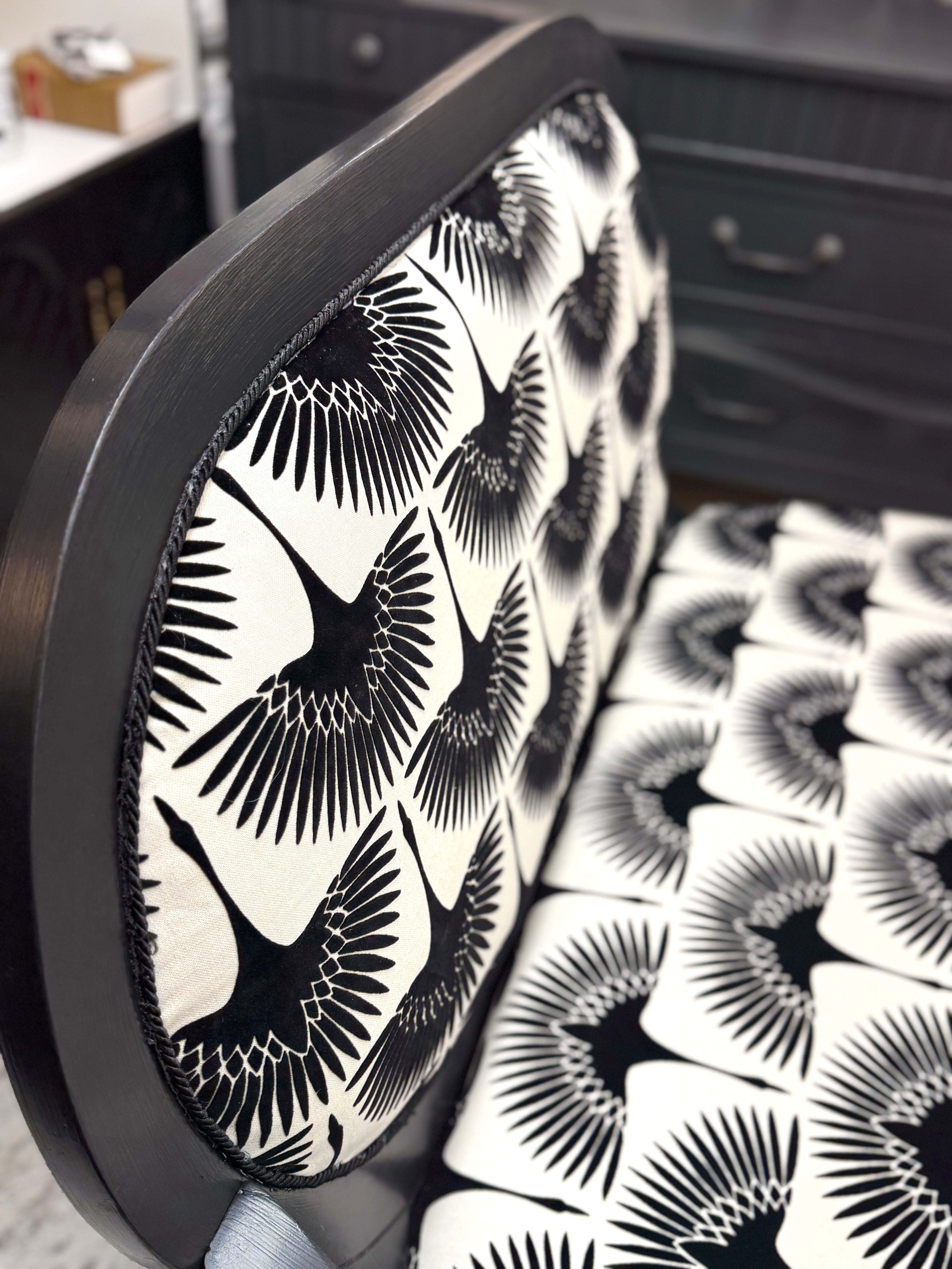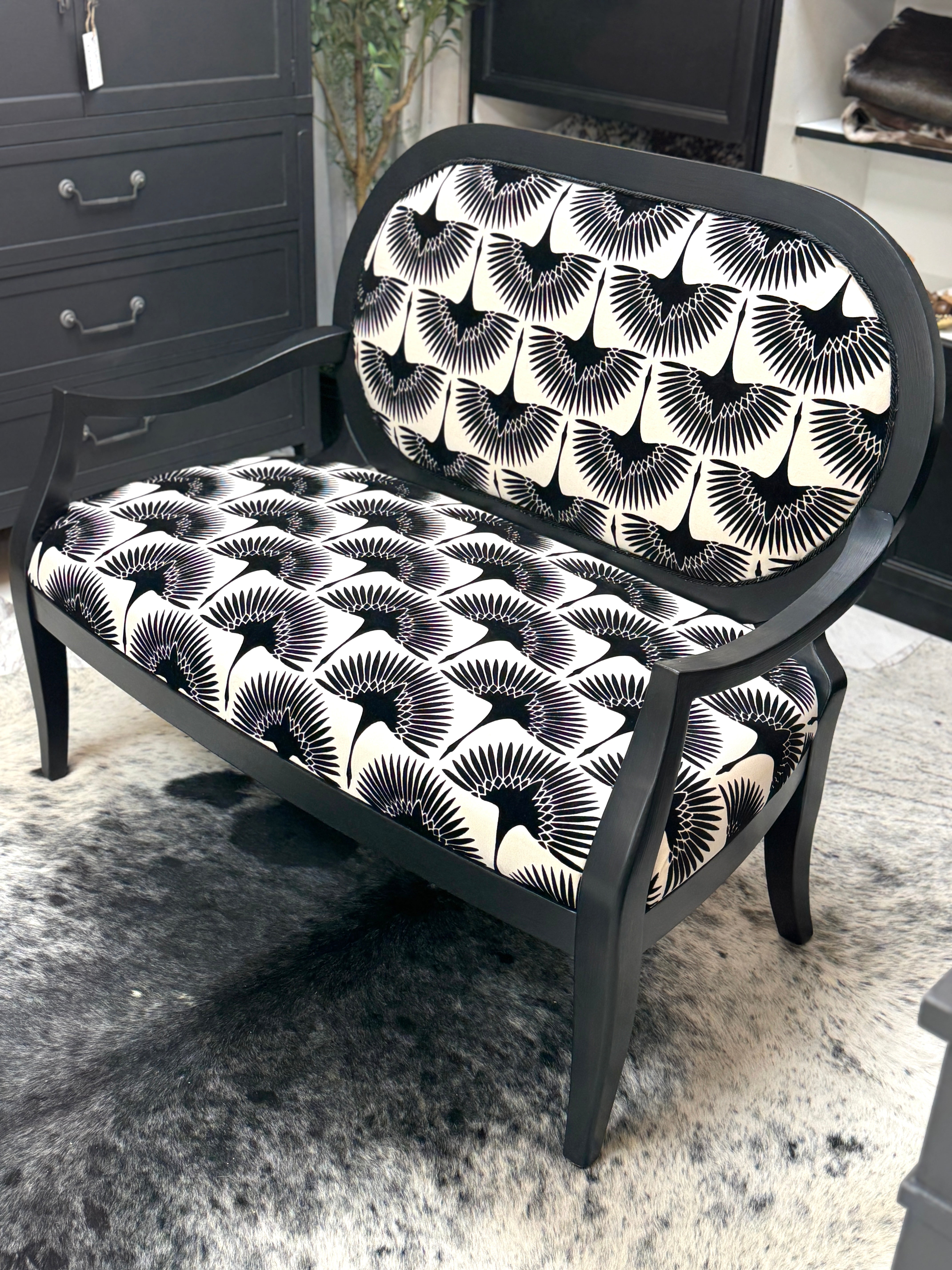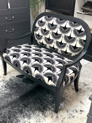46w x 22d x 18h (back - 38 1/2h). Black w/new upholstery. Delivery available.