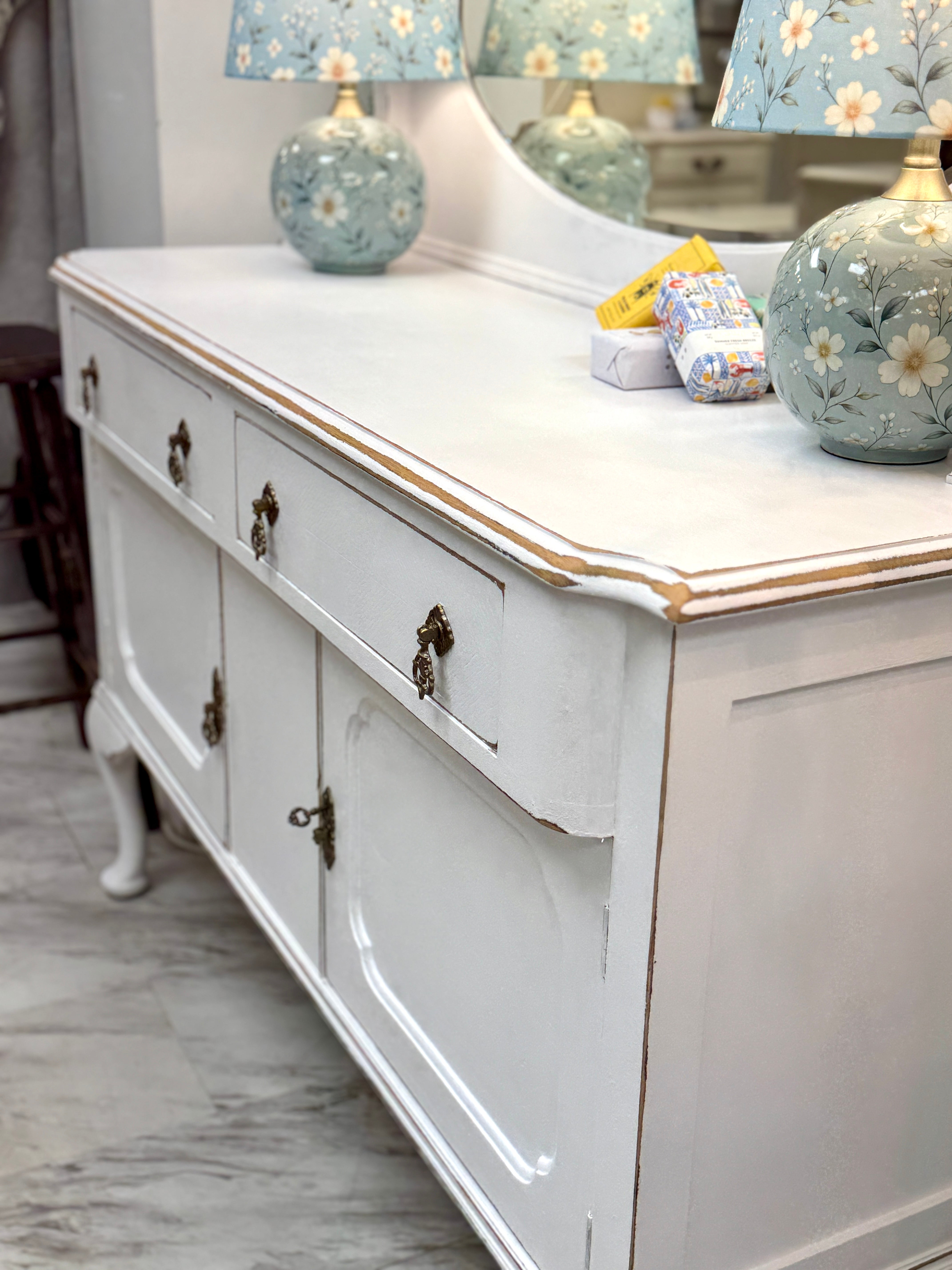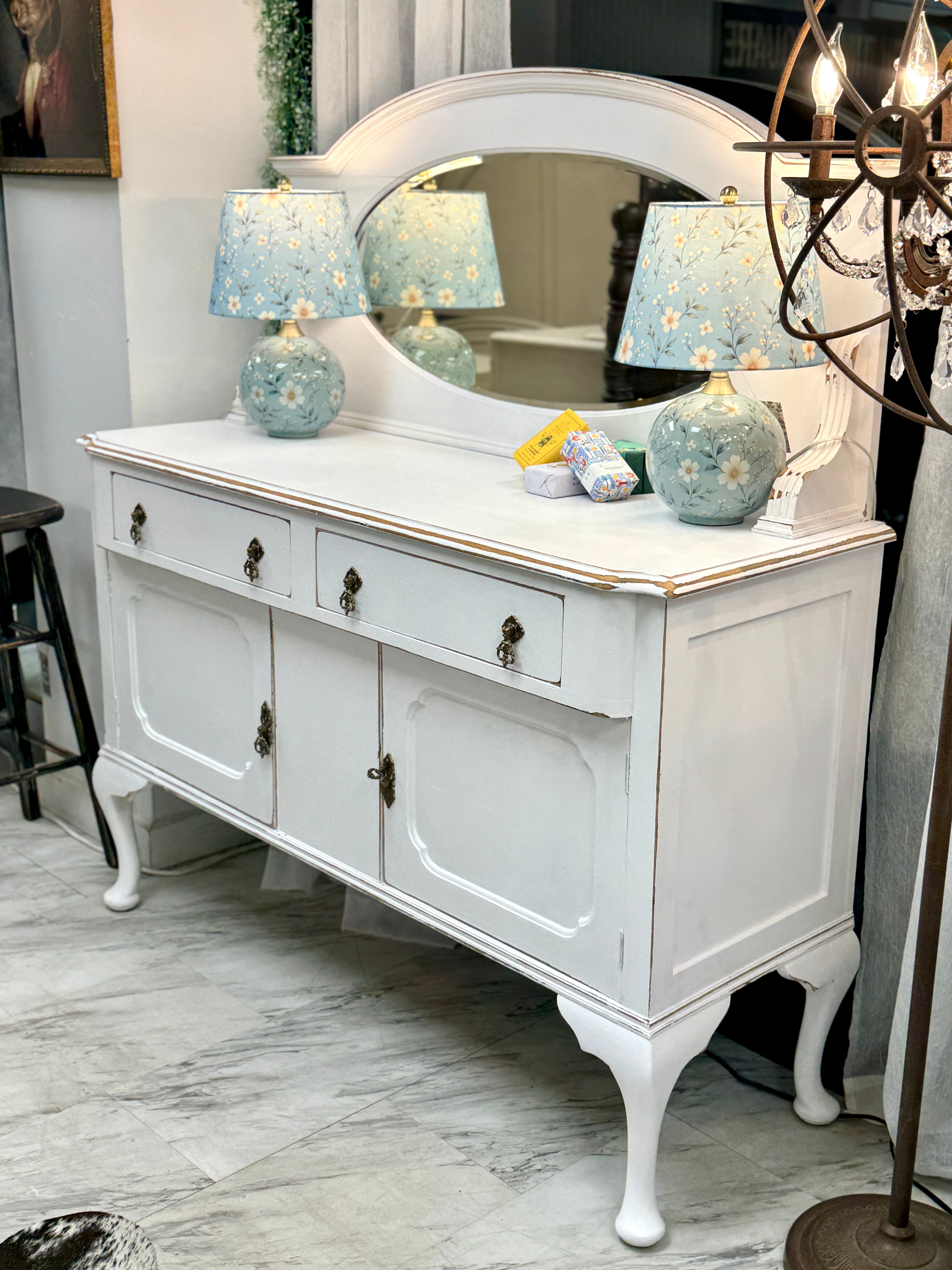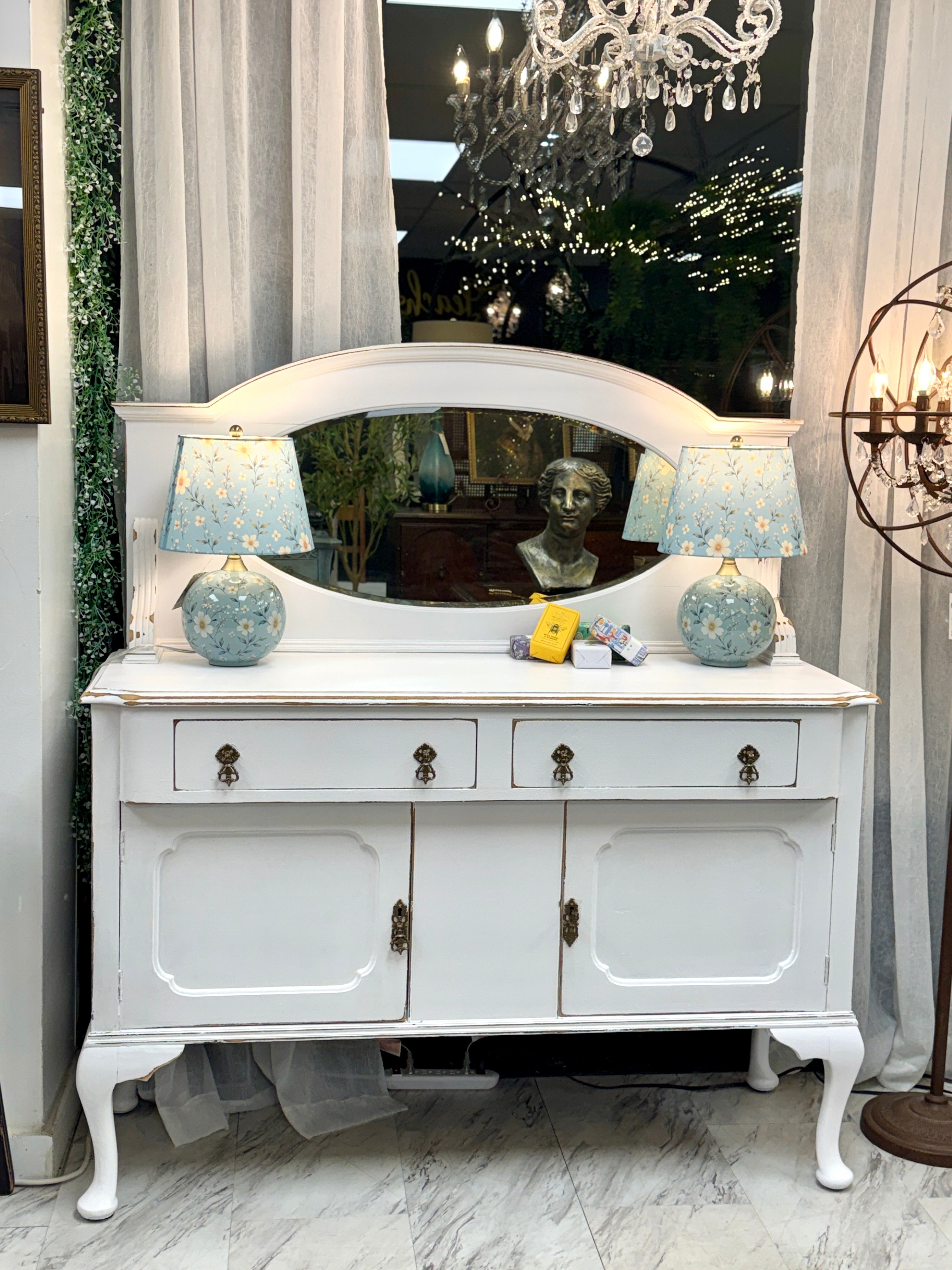 54 1/4w x 19 3/4d x 36 1/2h (mirror - 23 3/4h). White. Delivery available. Mirrored back is removable.