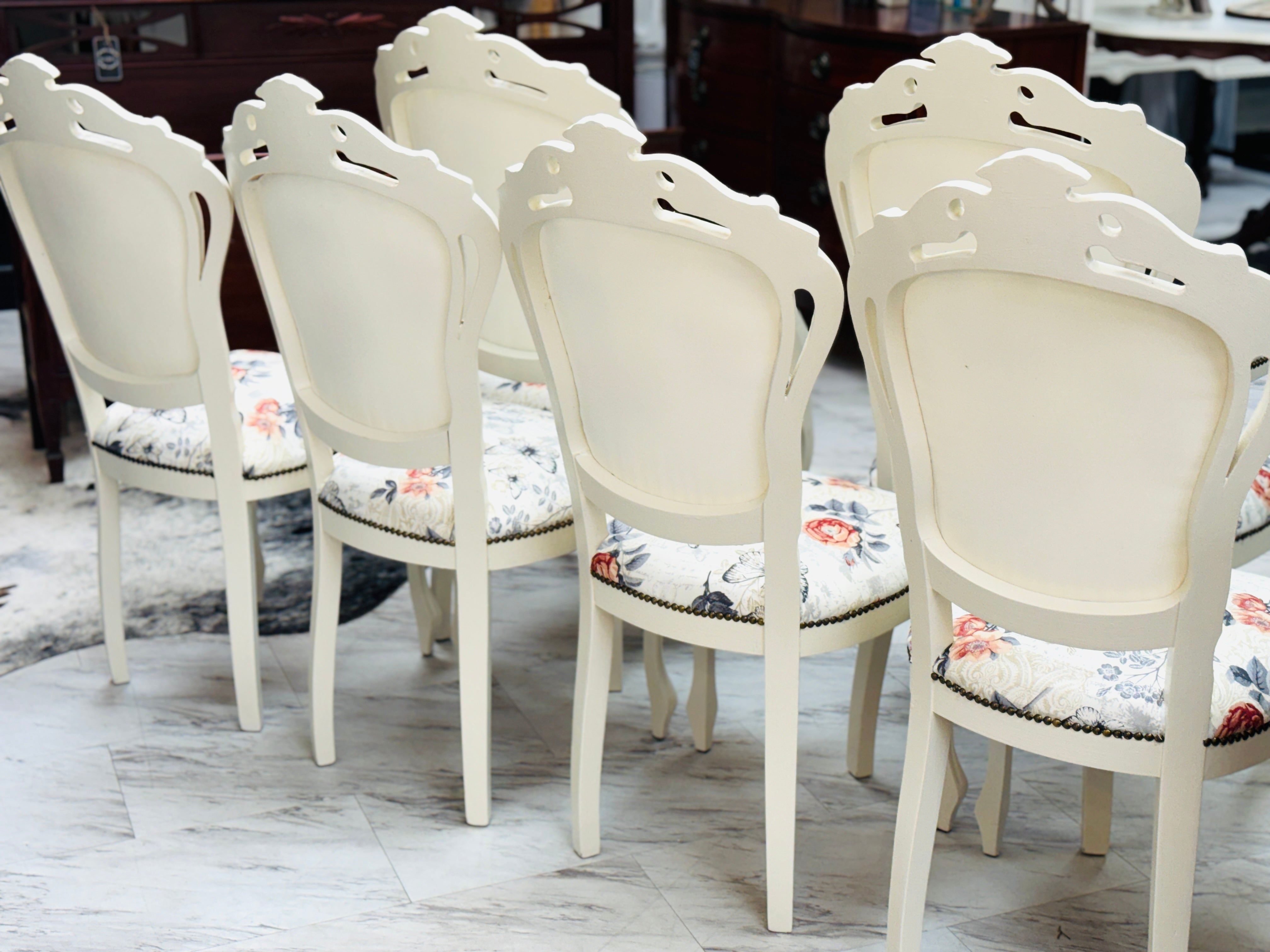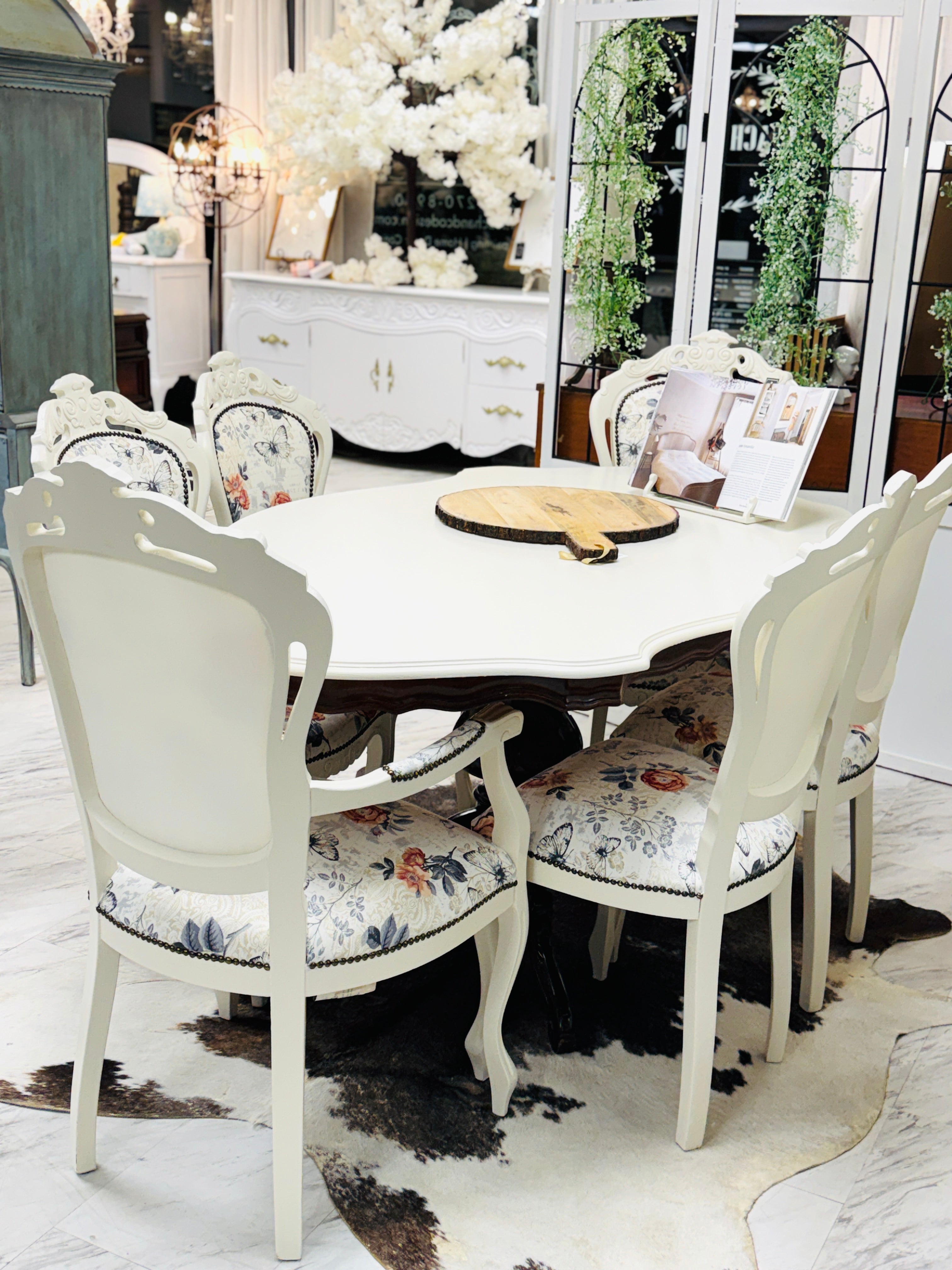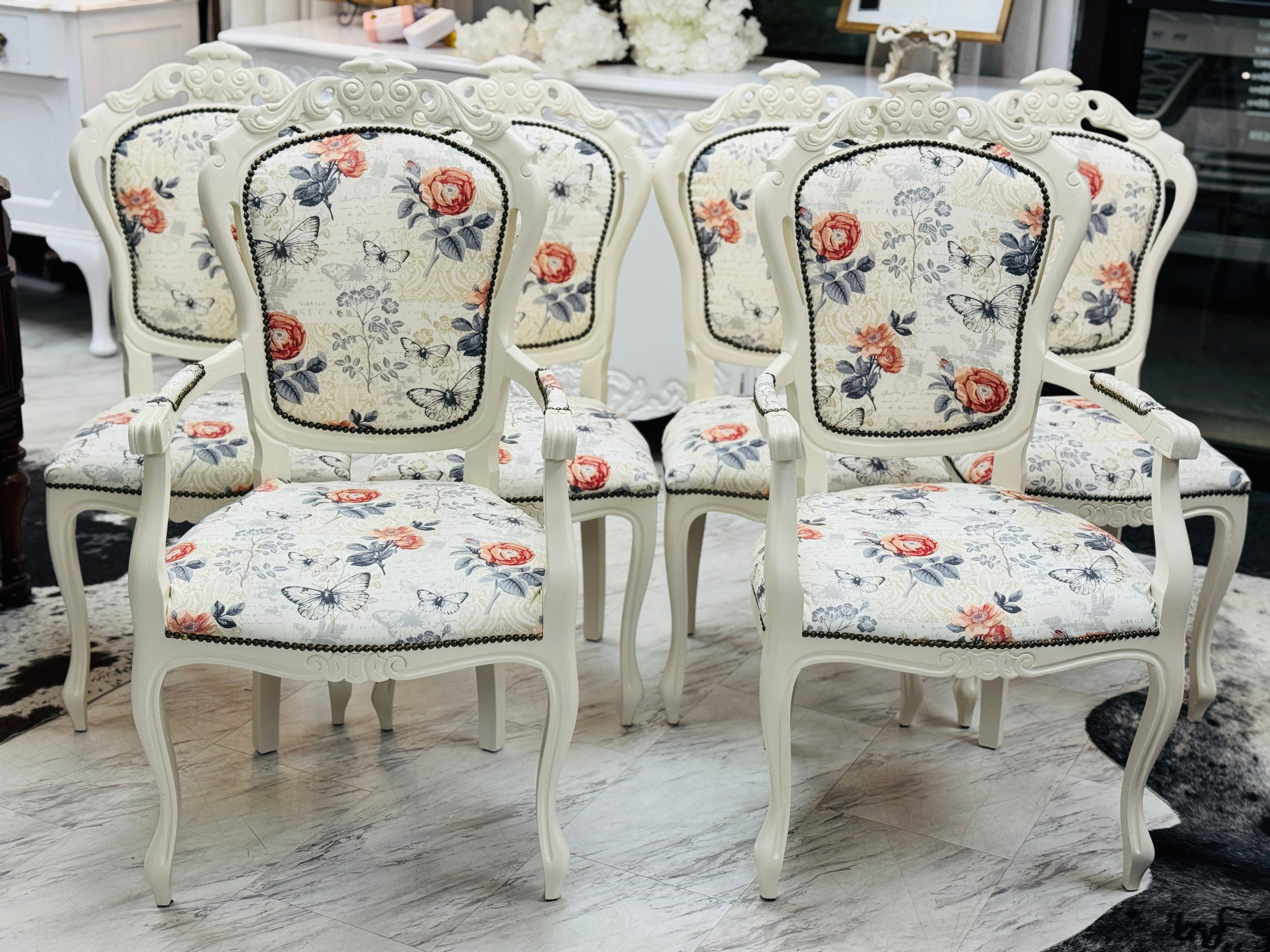 68 1/4L x 42 1/2w x 31h Arm chair 22w x 21d x 18h (back - 42h) Side chair 18w x 17 1/2d x 18h (back - 40 1/2h). New upholstery & cushion. Delivery available. Chairs not available separately.